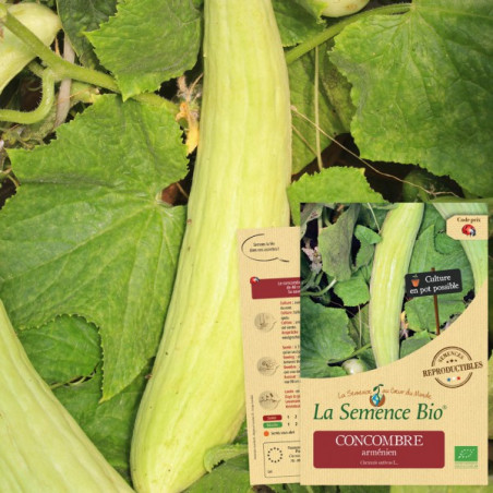 CONCOMBRE Arménien Famille : Cucurbitacées Semences certifiées 100% Bio et selon les lots également certifiées Demeter et/ou Bio Cohérence. Guide de Culture Exposition : ensoleillée et à l'abri du vent. Semis : à une profondeur égale à la taille de la graine en poquet de 2 à 3 graines. Levée : en 6 à 8 jours en sol à 15°C-20°C. Repiquage : lorsque le plant a 3-4 feuilles. Repiquez en pleine terre dès que les gelées ne sont plus à craindre. Culture associée : le concombre appréciera la compagnie des laitues, des radis, des pois, des oignons. Semez des fleurs pour attirer les insectes pollinisateurs et des aromates pour repousser les nuisibles par confusions olfactives. Evitez de les installer à proximité des tomates et des courgettes. Rotation : semez vos concombres sur un emplacement différent chaque année. Evitez de cultiver ce légume très gourmand après des légumes de la même famille. Après cette culture vous pouvez semer des légumineuses comme les fèves, les pois ou les haricots qui vont enrichir le sol. Conservation : une dizaine de jours dans le bac à légumes. Le concombre est une plante grimpante ou rampante qu’il est préférable de palisser afin d’éviter toute humidité sur les fruits. La culture en hauteur facilitera également la récolte ! Taille de la plante : 100 cm En cuisine Les conseils et suggestions ne sont donnés qu'à titre indicatif et ne sauraient par conséquent comporter une garantie de récolte. |